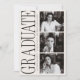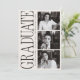 This graduate announcement features a bold editorial typography layout paired with a clean, modern photo grid for a striking and confident presentation. The oversized vertical “Graduate” headline creates a strong visual statement, while the black-and-white photography adds a timeless, elevated feel inspired by fashion editorials and modern print design.