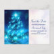Save the date Christmas party postcard with a modern electric blue Christmas tree. Decorated with lights all around. The background has faded blurry lights.