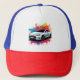 A digitally illustrated modern electric car depicted against a vibrant splash of multicolored paint, combining innovation and artistry.