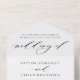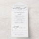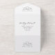 Modern Elegant Black and White Wedding All in One Invitation is a unique tri-fold invite option that is self-enclosed, sealed, mailed to guests with a detachable RSVP postcard; no need for envelopes! Design features an engagement photo of the couple with modern calligraphy script accents and classic typography. The guest address can be included on the back side - printed or handwritten, along with the postage for mailing. The back flap includes custom return address text, and the RSVP postcard includes the return address on the back so it can be torn off with help of a perforated fold and mailed back without an envelope.