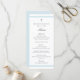 The classic elegant baptism menu card is a modern, clean featuring pastel blue stripes and a minimal cross with editable grey text.