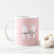 Personalized Modern Feminine Blush Pink Initial Name Monogram Coffee Mug. This stylish mug features a bold blue initial over a soft blush pink background, complemented by an elegant black script name. The monogram is displayed on both sides, adding a chic, personalized touch from every angle. With its modern minimalist design and feminine charm, this mug makes a perfect gift for birthdays, housewarmings, holidays, or just because. Ideal for bridal showers, bachelorette parties, or wedding day gifts, it combines classic elegance with a trendy, personal feel.