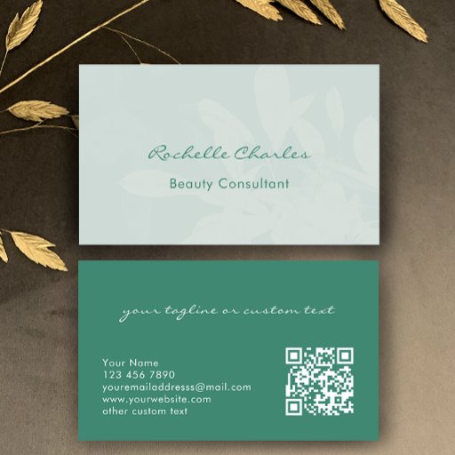 Personalize this stylish eucalyptus green toned business card with your name and contact information, logo, and QR code. Customize the modern script with your own words for the perfect contact card. On the front is space for you name, your business, the services you offer and your logo or image. On the back you can add your tag line, or personal note. The simple clear script is editable. You can add your QR code for a modern business card. The pale green beautiful botanical design is trendy and elegant. This card would work well for any profession, like a beauty consultant, skin care specialist, a beautician, a designer, therapist, a hair stylist, or a life coach to name a few.