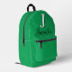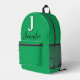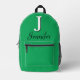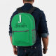 A personalized monogram backpack designed in a modern elegant style. This elegant green backpack features a bold white initial 'J' with a black shadow and a customizable name in black script font. Perfect for adding a touch of sophistication and personalization to your everyday style. Ideal for school, work, or casual outings, this backpack combines functionality with a chic design that stands out.
