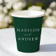 The elegant, personalized green wedding paper cups are perfect for your wedding reception, rehearsal dinner, engagement party, and more! The minimalist green wedding paper cups are perfect for summer, fall, winter, and spring weddings. The design features a chic modern calligraphy script with your names in white lettering on a dark green background. The design coordinates with our Modern Elegance Green wedding collection.