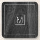 Coasters featuring your monogram initial inside a square, white border on a printed black wood grain background.