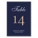 Modern Elegant Navy Blue Script Wedding Table Number. The card is modern and elegant in dark blue with a thin border and a script in white and peach colours. Customize each card separately for each table number and put it separately in your cart. Personalize all the text on the table card.