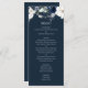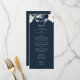 This elegant and simple navy blue wedding menu features blue, green, white and silver grey watercolor botanicals on top of a deep blue background.