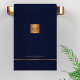 Trendy luxury exclusive looking monogrammed bath towel set featuring a faux gold copper metallic glitter square and lines over a stylish classy navy blue background. + Personalize it with your name or family name and monogram name initial.