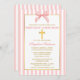 Modern Elegant Pink Blush Striped First Holy Communion Invitation includes Pink and White Stripes, Gold Frame, Gold Cross and Pink Bow Ribbon.