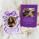 Celebrate your graduate’s achievement with this elegant graduation announcement, featuring a bold purple bow and ribbon design on a light purple background. The graduate’s circular photo is beautifully framed by the bow, while "Graduate" is showcased in a stylish handwritten purple script. Personalize with the graduate’s name, school, and graduation year for a unique and meaningful touch. The back includes an additional photo and space for a custom message, making this design perfect for high school and college graduates. Share this special milestone with a sophisticated and timeless keepsake!