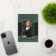 A unique photo graduation announcement card, featuring design elements of elegant handwritten style script. The word "Graduate" and the graduates name in real foil (foil colour options are gold, silver and rose). The graduates photo is thinly edged in a white border and decorative wavy trim. The design is complimented with a background in shades of mint green. The back of the card offers a personalized announcement text space for that special graduate. To see more items like this, visit my store here at "www.Zazzle.com/LakeViewCardCo". Thanks