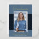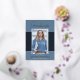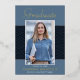 A unique photo graduation announcement card, featuring design elements of elegant handwritten style script. The word "Graduate" and the graduates name in real foil (foil colour options are gold, silver and rose). The graduates photo is thinly edged in a white border and decorative wavy trim. The design is complimented with a background in shades of dusty blue. The back of the card offers a personalized announcement text space for that special graduate. To see more items like this, visit my store here at "www.Zazzle.com/LakeViewCardCo". Thanks