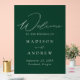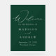 Elegant wedding welcome acrylic sign featuring "Welcome" in a modern white calligraphy script with a dark hunter green acrylic background. Personalize the green wedding sign by adding your names, wedding date, and wedding location. The vertical welcome sign is designed to coordinate with our Modern Elegance wedding collection and is available in other colours/style options.