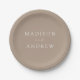 The elegant, personalized taupe wedding paper plates are perfect for your wedding reception, rehearsal dinner, engagement party, and more! The minimalist taupe wedding plates are perfect for summer, fall, winter, and spring weddings. The design features a chic modern calligraphy script with your names in white lettering on a taupe background. The design coordinates with our Modern Elegance Taupe wedding collection.