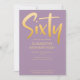Introduce new modern, elegant 60TH birthday party invitation, violet background with gold colour handwritten typography text "sixty". Customize this template card by adding your own party information.