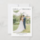 Modern, elegant flat thank you card features a minimalist black and white design with "love and thanks" on the front. Personalize with your wedding details with the easy to edit template featuring an elegant script font and classy serif font. Replace the photo on the front with one from your wedding. Add your own message or delete the text so you can handwrite your message on the back. Check out matching items in the “Modern Elegant” collection.