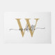 Girly Modern Elegant Stylish White Gold Monogram Initial Name Script Custom Personalized Doormat. This design featuring a first name in a pretty hand lettered swash tail font calligraphy (or typography) with monogram initial in gold and black on white colour background. Great stylish feminine housewarming gift, also for birthday, wedding, bridal shower, anniversary, bachelorette party and It’s for the girl wholikes clean minimalist things.