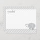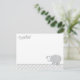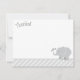 Sweet and whimsical baby shower thank you notes feature "Thanks!" text and an adorable newborn baby elephant calf with heart shaped splashes, with space for your handwritten message. The design includes a border pattern of diagonal stripes, polka dots on the back, and a gender neutral colour scheme of grey and white.