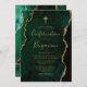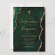This elegant confirmation invitation features a background image of emerald green watercolor agate trimmed with faux gold glitter. A gold faux foil cross appears above customizable text that combines gold-coloured modern handwriting, copperplate and italic fonts. The reverse side features a coordinating emerald green and gold agate design. The gender-neutral design is deal for a boy's or girl's confirmation.