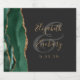 This modern wedding design features an emerald green watercolor agate and gold faux glitter border on the left edge. Personalize it with the couple's names in elegant gold-coloured handwriting script over a large ampersand on an off-black background, with the wedding date below.