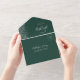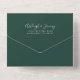 The left-hand edge of this elegant modern all-in-one wedding invitation and RSVP features a silver faux glitter border. The customizable text combines silver grey whimsical handwriting, copperplate and italic fonts on an emerald green background. The return address appears on the outside flap and the reverse side of the detachable RSVP card in silver grey text on solid emerald green.