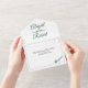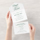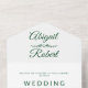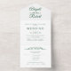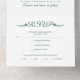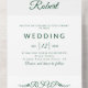 Modern emerald green typography and small flowers on white background all in one wedding invitation. It displays your names in a cursive script elegant style typography and two small emerald green flowers with leaves on both sides of the ampersand on white. The RSVP can be detached.