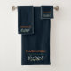 Modern very dark blue Thanksgiving bathroom decoration mixing different fonts and colours, featuring beautiful watercolor eucalyptus branches with burnt orange buds, adding to  the customizable typography Thanksgiving, time for caring, sharing and feeling grateful. The dark blue background provides contrast and adds to the modern feel to the towel set.   A beautiful fall decor and accent piece that shows your appreciation, gratitude and says thanks for all the blessings in our lives.