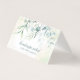 Elegant folded business card featuring eucalyptus leaves and greenery with a hint of blue and speckles of faux gold glitter at the top, over a pastel watercolor wash. The backside has your contact information over a matching shade of soft blue green. Use the template to generate a QR code or remove it in the design editing tool. This simple, rustic design is great for a gardener or landscape professional.