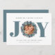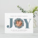 Modern Eucalyptus Photo Typography Christmas Card - JOY is featured in modern bold typography in blue with a eucalyptus and holly berry wreath surrounding your favourite photo. Editable greeting reads " Wishing you a holiday filled with JOY." All our love, your family name and family blue, but you can easily change the colour in the design tool.