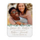 This wedding photo save the date magnet features a modern design template with your photo on the top with a border of hand painted watercolor eucalyptus greenery and your wedding details beginning with the words, "Save the Date" in hand lettered dark gold script to personalize. Best of wishes for your engagement and wedding! Designed by Susan Coffey.