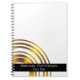 A professional notebook design featuring golden circles over a white background embellished with a thin black band. Personalize with your details. See the matching business card here: