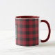 Custom-designed monogram coffee/tea mug featuring personalized monogram and family name on a black and red festive buffalo check/plaid/gingham check pattern.