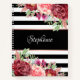 This personalized notebook features a modern floral design with watercolor burgundy and blush flowers and foliage on a black and faux rose gold foil striped background. The back has a matching floral motif. Personalize the monogram with your name or initials.