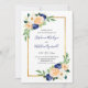 These modern wedding invitations feature a watercolor floral design with white, coral and navy blue flowers and a faux gold border. Personalize the invitation wording with your own text.
