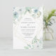 Elegant watercolor greenery wedding invitations features white flowers and botanical foliage that decorate the background with a modern gold geometric frame centre. use the online template tools to personalize this unique invite for your special day.