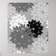 Poster in a modern take on a traditional Japanese floral kimono print - stylized flowers in shades of graphite and light grey / grey, black and white on medium grey background