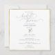 A very small branch of lily of the valley spring flowers with a gold (not real foil) ribbon around it boutonnière style, hand-drawn in black graphite pencil, decorates this elegant, modern, simple and sophisticated spring bridal shower invitation template that features a brushed gold frame and modern calligraphy with ample flourishes. This art drawing bridal shower invitation would be a lovely choice for couples who love black, white and gold, art drawings and modern minimalist designs with a touch of updated formal and traditional.