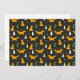 A fun and modern Christmas greeting card featuring a whimsical, seamless pattern of stylized orange foxes wandering through green and white pine trees under a gentle snowfall. Set against a chic, dark brown/charcoal background, this design is perfect for those who love contemporary or rustic woodland holiday themes. Send a cheerful and unique greeting this holiday season with a card that stands out!