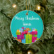A cute , fun and modern image of wrapped Christmas presents in pink, purple, green and bright modern colours. Against a customisable bright blue background. Fun and colourful Christmas style.