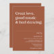 Great love, good music & bad dancing. Modern funny minimal design with trendy typography on terracotta burnt orange background. The text can easily be personalized for a unique one of a kind design for your special day.