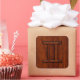 A Gemini zodiac symbol on a brown mahogany wood grain like print background. A classic rich style design for a great custom birthday gift idea for him.