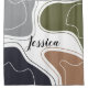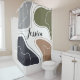 Personalized shower curtain featuring a modern abstract geometrical shapes pattern in green, gray, blue and brown and a personalized name print in the center.