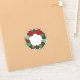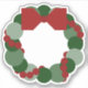 Modern geometric Christmas wreath features green dots in three different shades and sizes with a strand of smaller red dots reminiscent of cranberries winding around the circular pattern. The wreath is topped with a red bow.