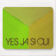 Y-shaped geometric design where lines split the square into three areas. Each area with a slightly different colour, all in green to yellow tones. The colour scheme stands out as fresh, a touch of cubism, somehow etnic, a tad psychedelic, and unique. Text «YES JA SI OUI» is a positive message in some of the world's bigger languages. Default text can easily be customized.