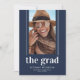 Simple 2025 graduation announcement card featuring a classic navy blue background that can be changed to match any school or favourite colour. The main focus is on the graduate themselves – their photo takes centre stage, with two sleek lines running down either side to add a touch of modernity. The result? A statement that screams "this is the grad!". And of course, their name, school/college, and class year are elegantly displayed, making sure everyone knows who the star of the show is. The bold, geometric pattern on the back adds a touch of sophistication, without taking away from the front.