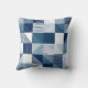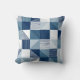 This throw pillow features a modern geometric pattern of squares with hand-drawn lines in shades of blue from light blue to navy blue with white.
