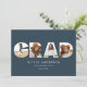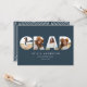 Geometric modern typography elegant natural navy blue and white multi photo graduation announcement card.