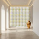 This stylish ceramic tile features a contemporary geometric pattern with yellow lines and shapes on a clean white background. The design offers a modern and minimalist aesthetic, perfect for adding a touch of sophistication to any space.