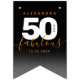 Celebrate the big five oh with this stylish modern design, which features striking block and handwritten lettering set on alternating rich-black-to-smoky-grey and orange backgrounds.